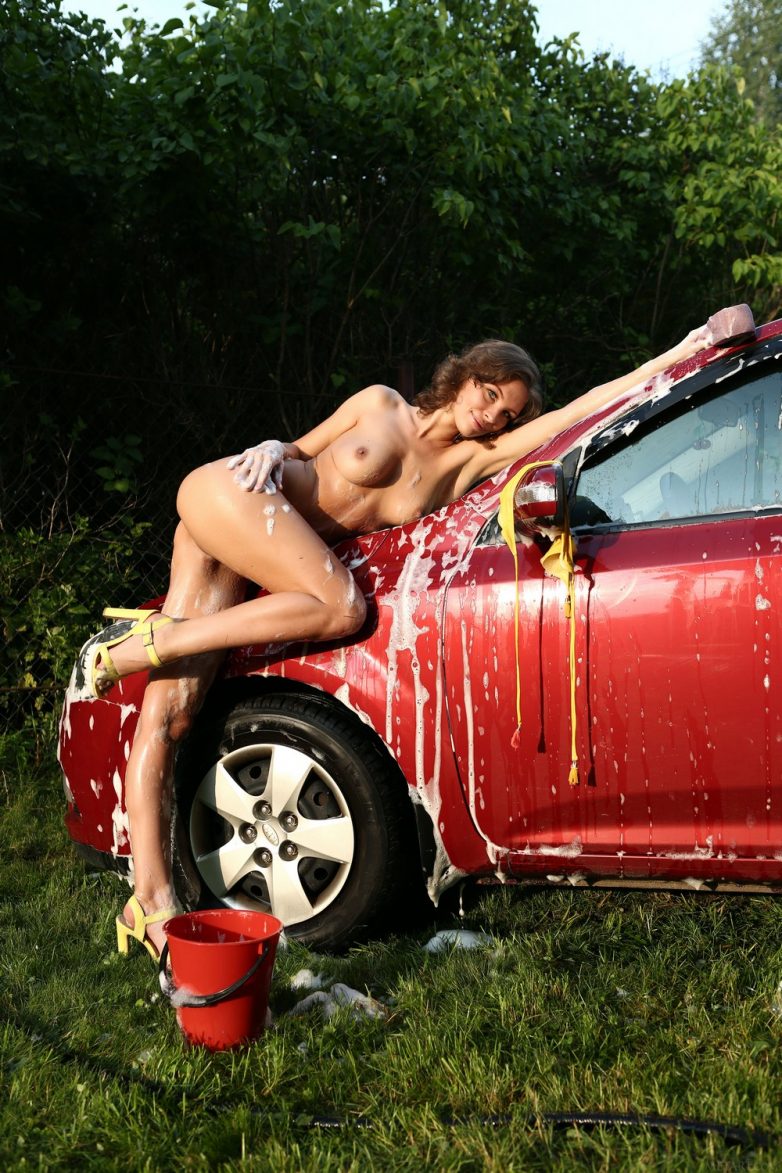 Знойная красотка моет машину
