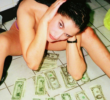 «Моя лучшая ночь» — это автопортрет, сделанный, возможно, в один из моих самых успешных вечеров. Колени в ушибах и синяках рассказывают правдивую историю тяжелой ночи, в течение которой часто приходилось вставать на колени на грязном ковре в комнате для приватных танцев. У меня был ритуал: после ночи работы, перед тем как покинуть клуб, я, сидя на полу и раздвинув ноги, раскладывала перед собой купюры в стопки по сто долларов. Помню, как я была рада и возбуждена и как хотела заработать еще больше следующей ночью.