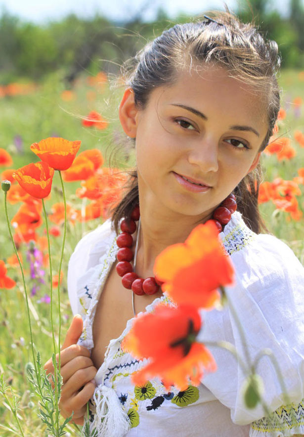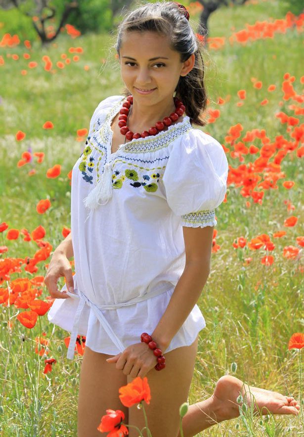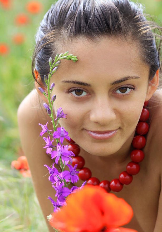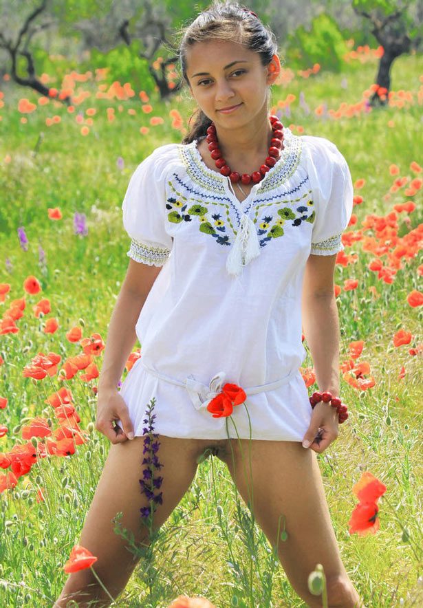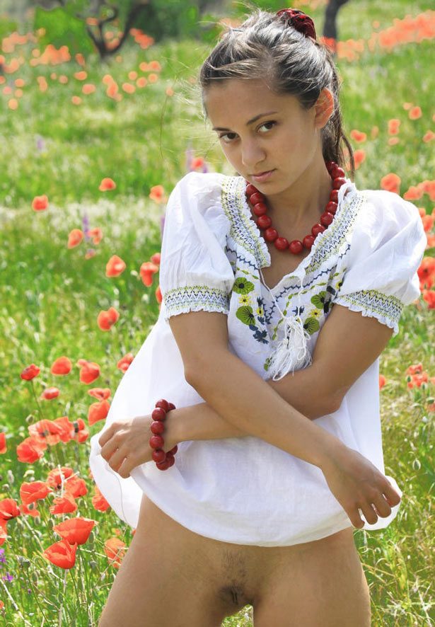 В ясный солнечный день красивая молодая татарка щеголяет с голой грудью на маковом поле.
