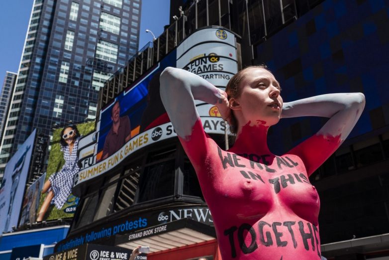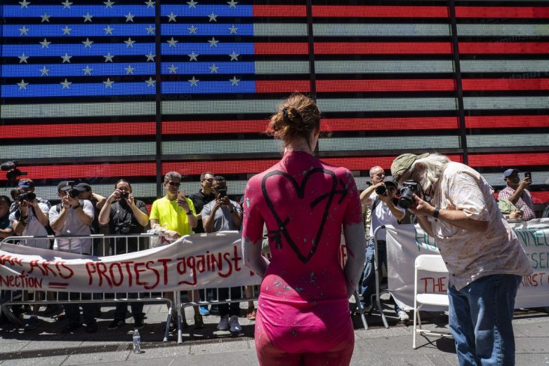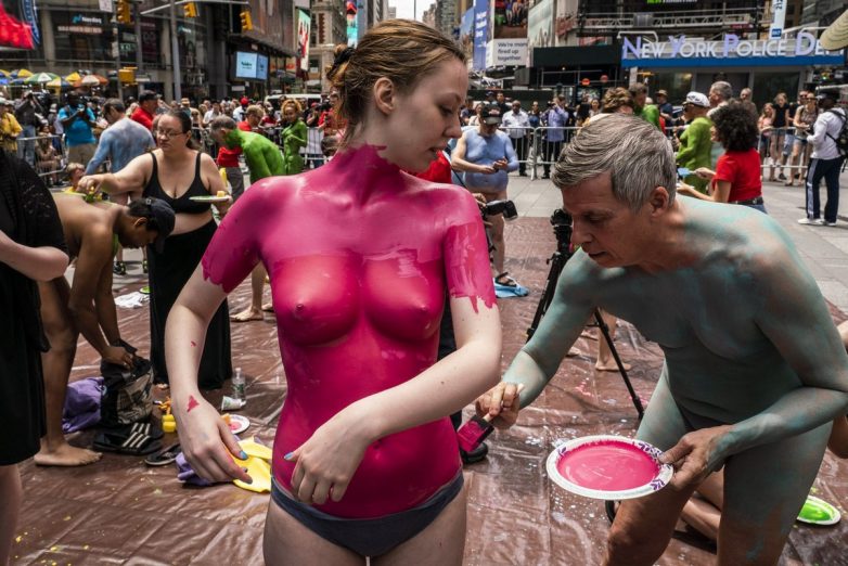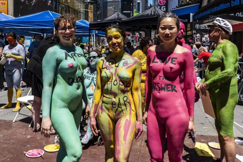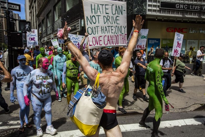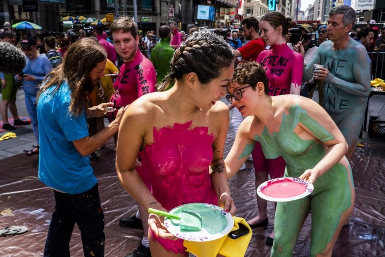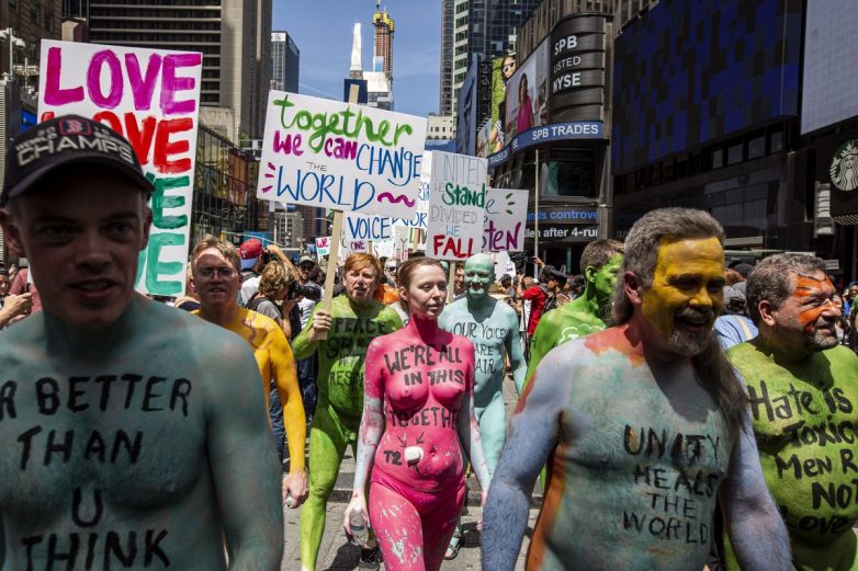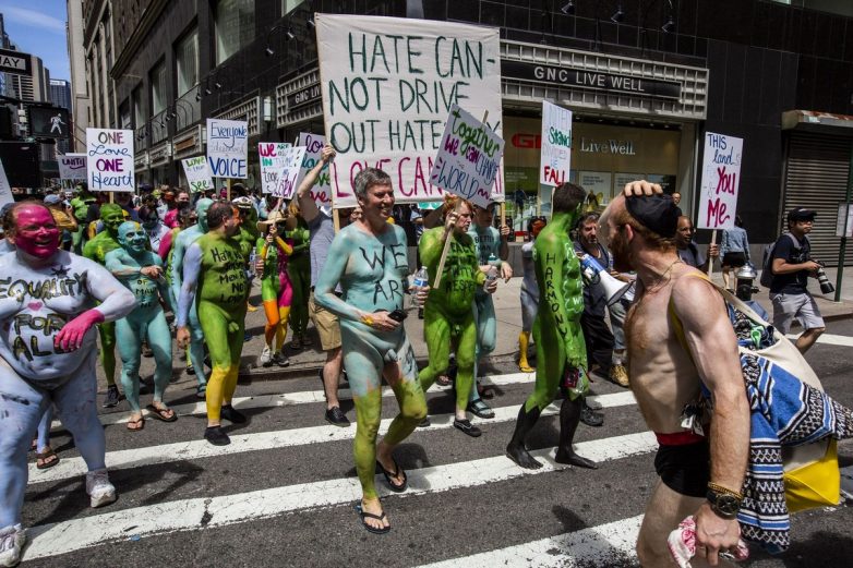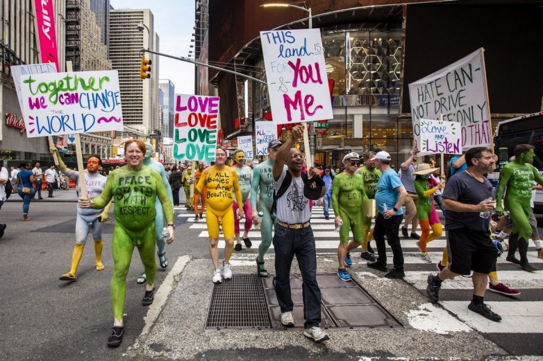 В субботу 15 июня в Нью-Йорке прошел голый протест. Обнаженные люди, тела которых были покрыты краской, прошли от Таймс-сквер до парка Мэдисон-сквер в рамках протеста против раскола в обществе. Мероприятие организовано Human Connection Arts. В этой организации считают, что все люди должны восприниматься одинаково, независимо от расы, пола, размера, формы, возраста и даже политических взглядов.