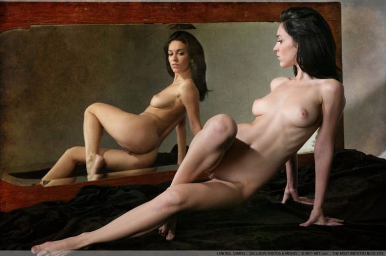 Голая брюнетка перед зеркалом