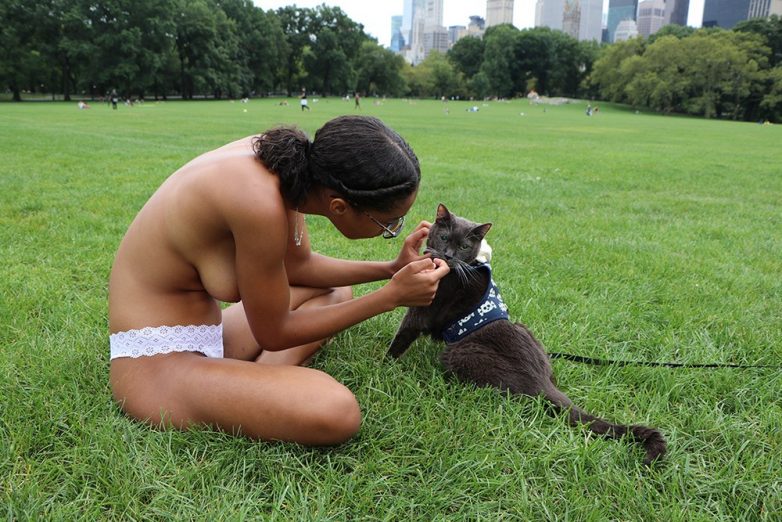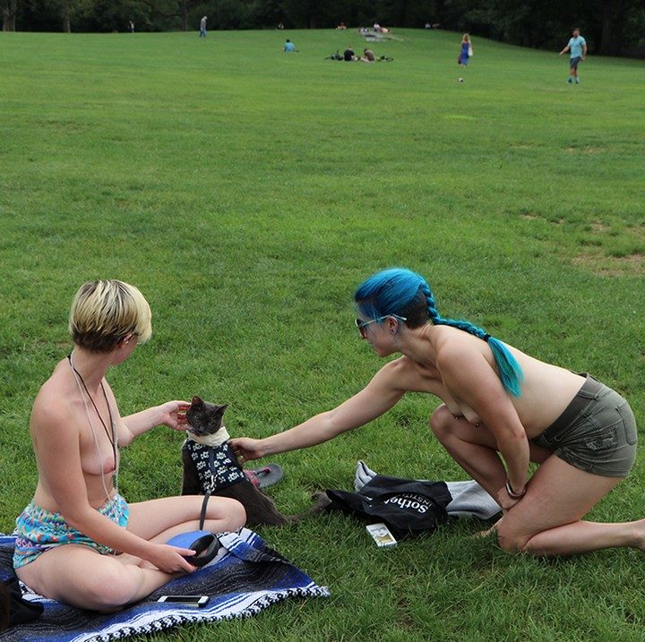 Группа женщин, которые борются за право находиться в общественных местах с обнаженной грудью наравне с мужчинами, устроила очередные топлес-посиделки в нью-йоркском парке. На этот дамы отправились на Овечий луг в Центральном парке, некоторые взяли с собой домашних животных. Девушки топлес, а кое-кто и совсем голышом, общались, кушали фрукты и наслаждались последними теплыми деньками.