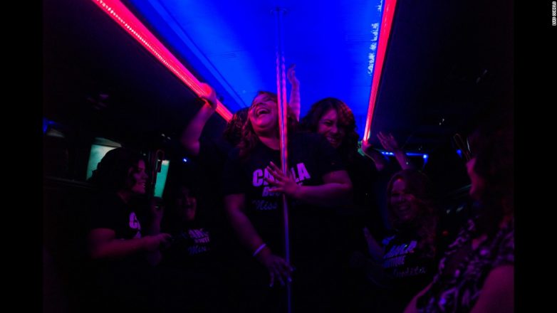 Мирли Эспиноза и Аделаида Анаквин танцуют в автобусе по пути на финал конкурса.
