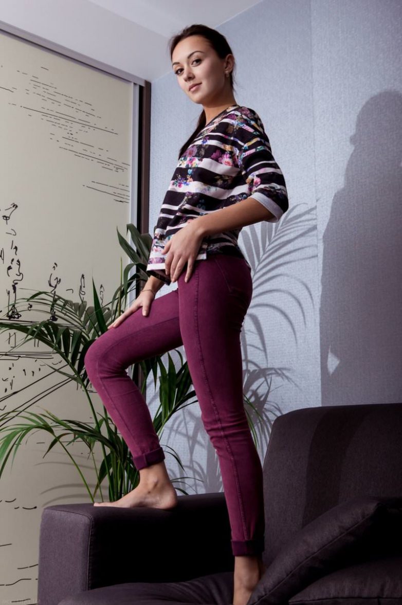 Стройная шатенка в обтягивающих штанишках