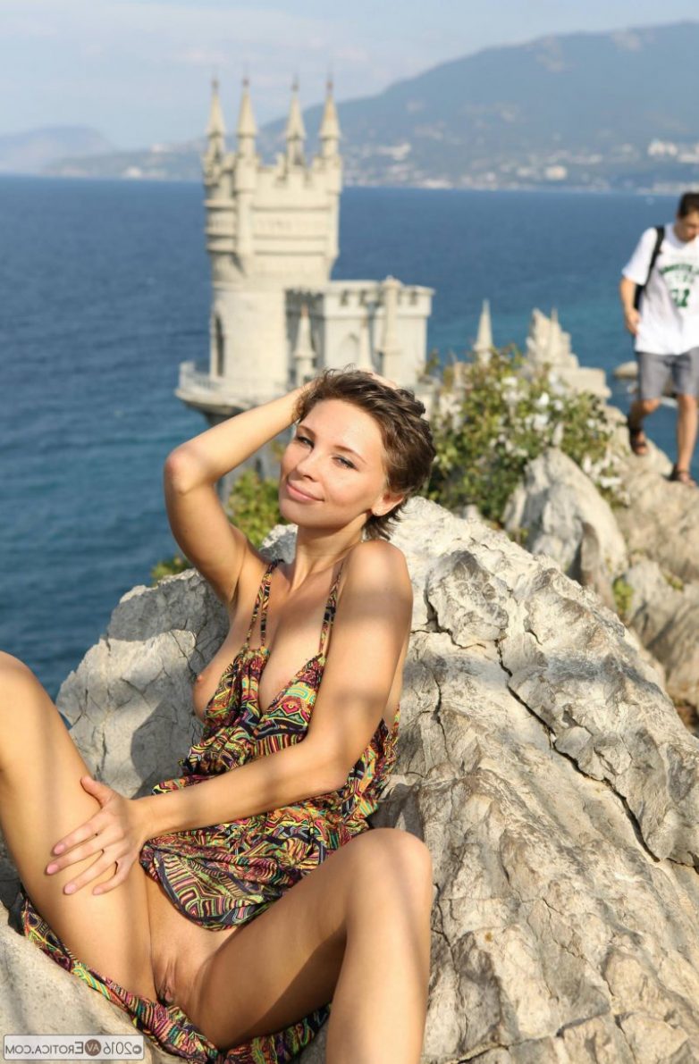 Красотка с короткой стрижкой позирует на фоне «Ласточкина гнезда»
