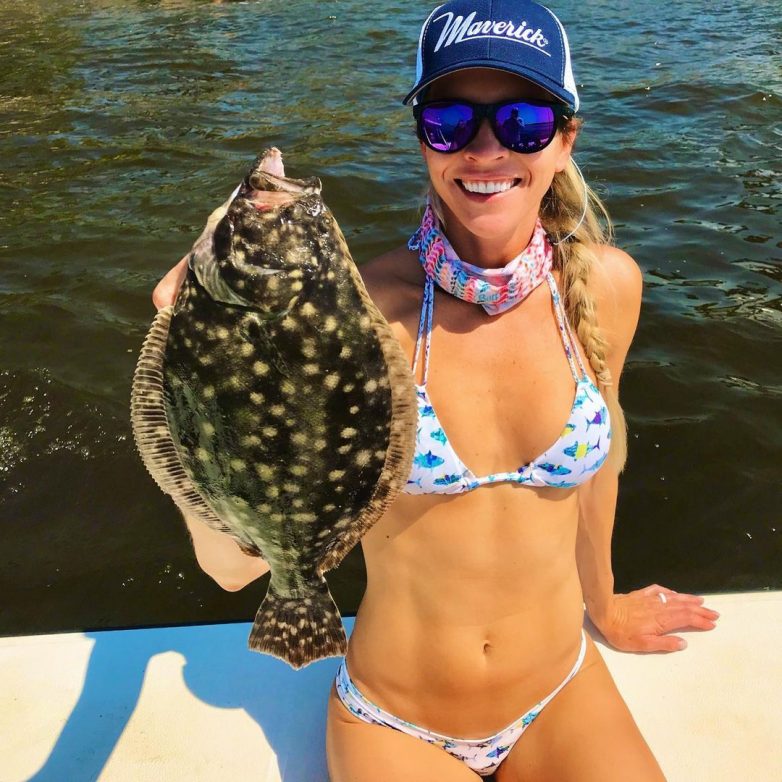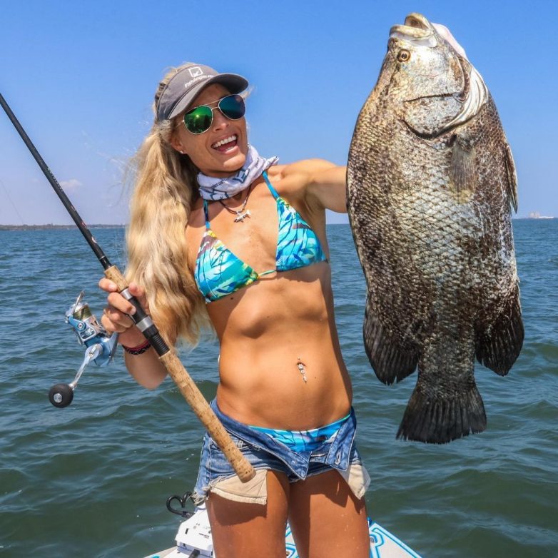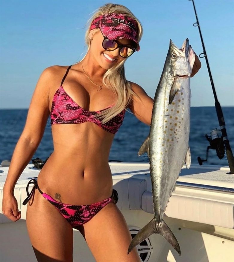 Стройные девушки, одетые преимущественно в бикини, отправились на рыбалку и хвастаются своими уловами.