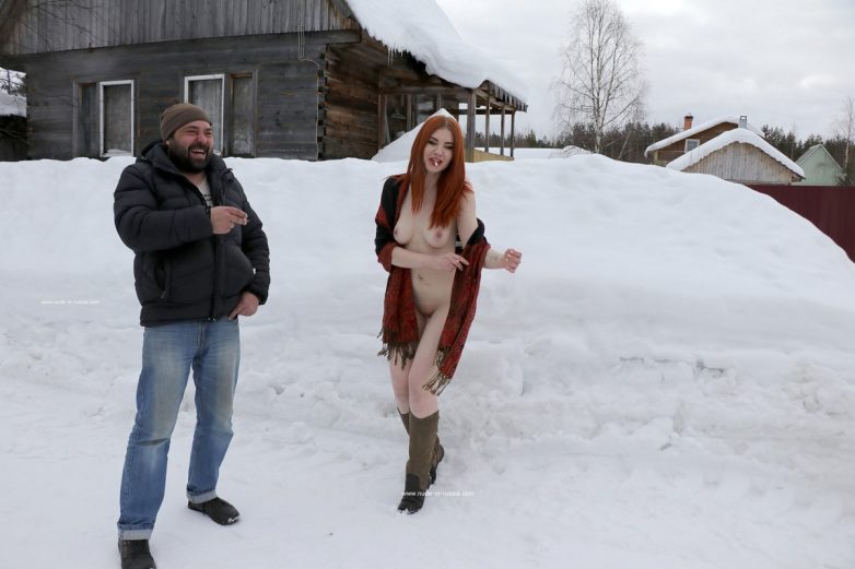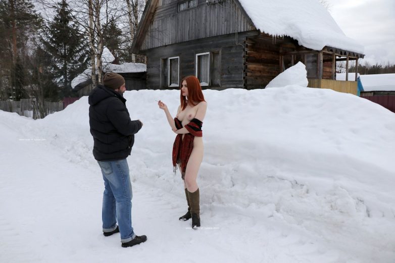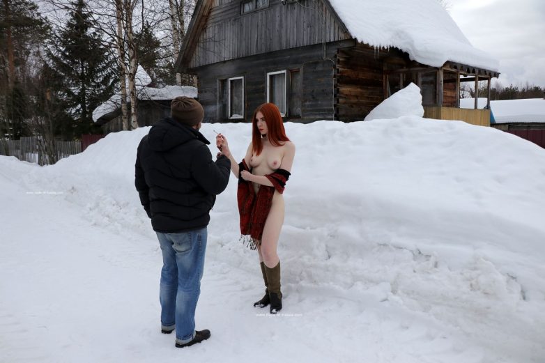 Рыжая Татьяна вышла на перекур в зимней деревне