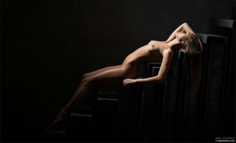 Ошеломительная блондинка в концептуальной фотосессии на ступенях