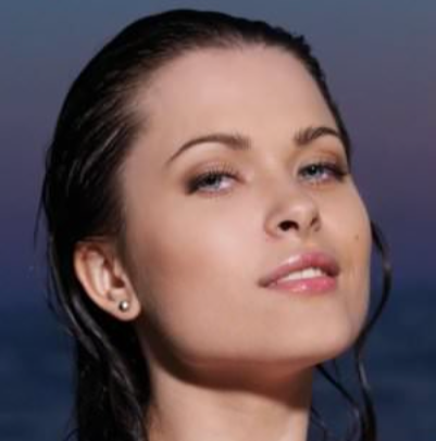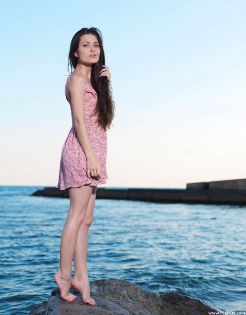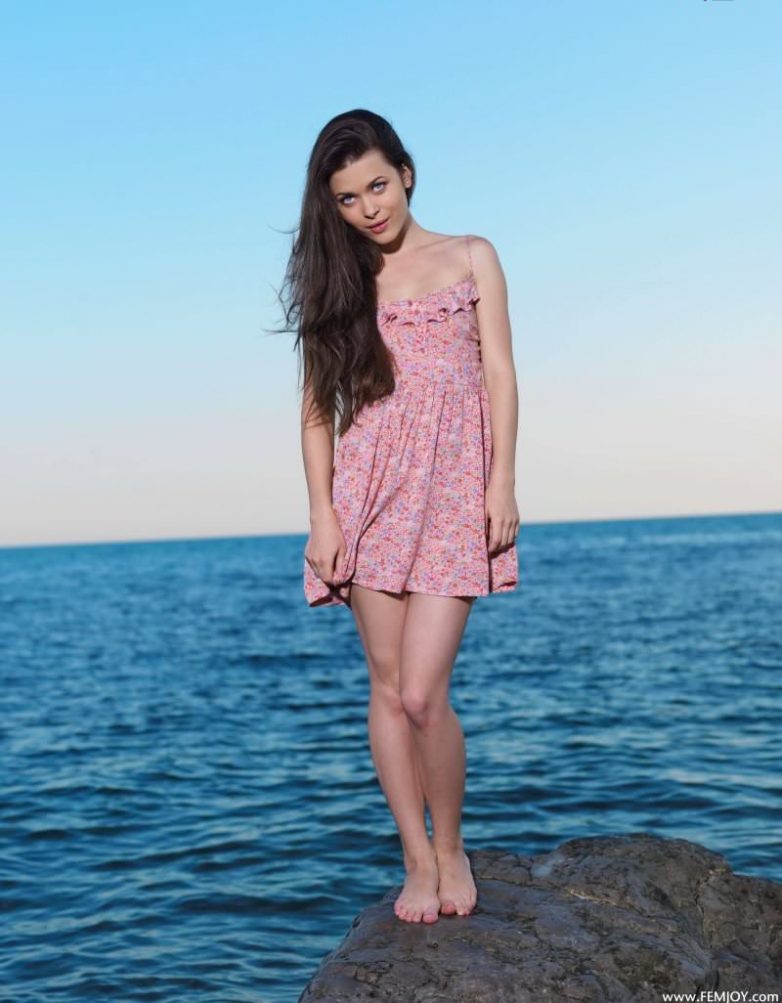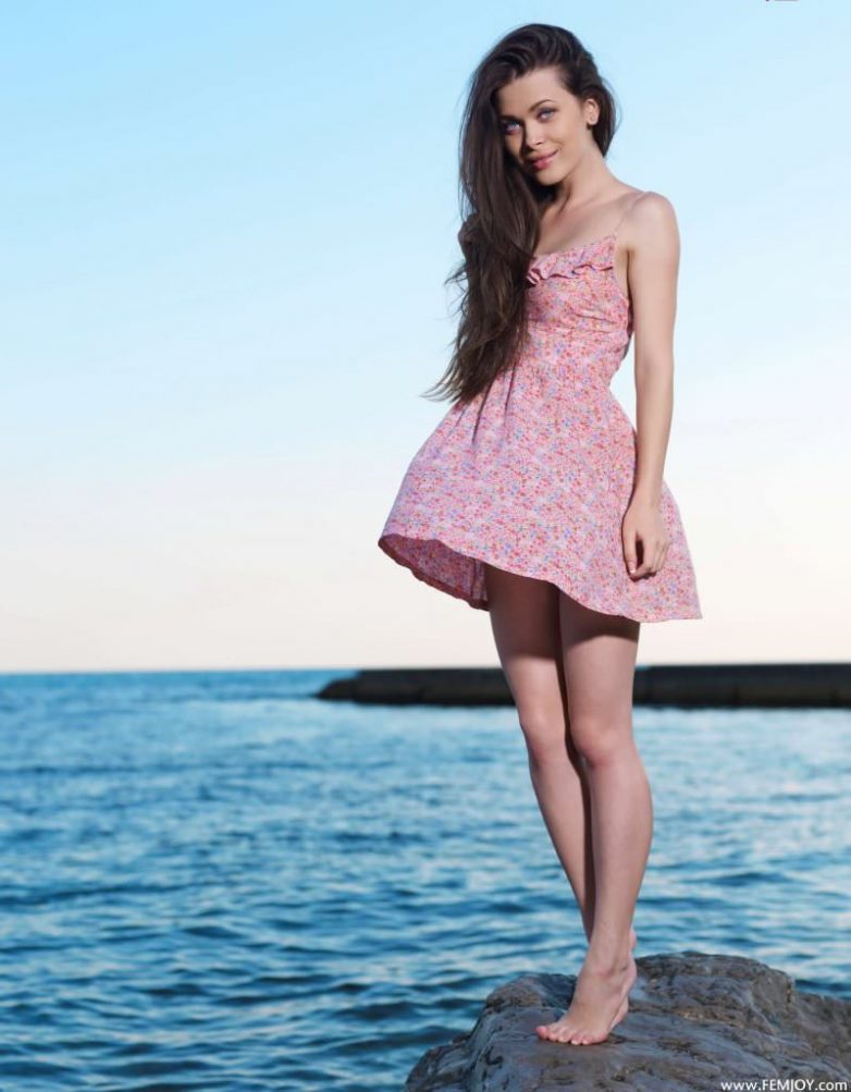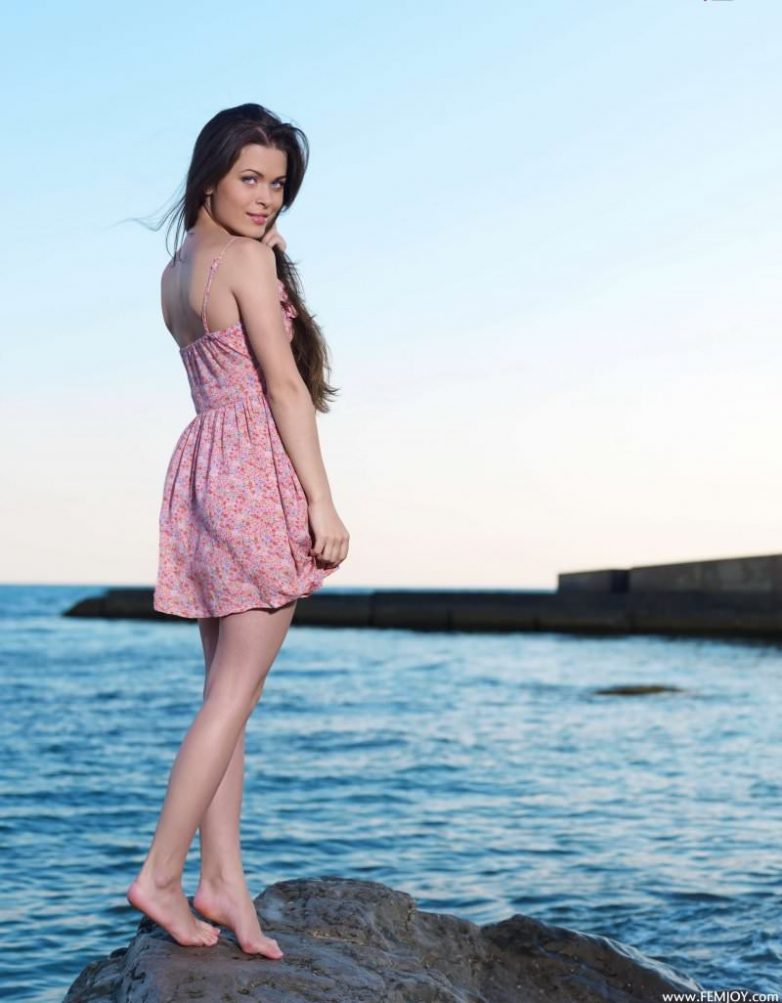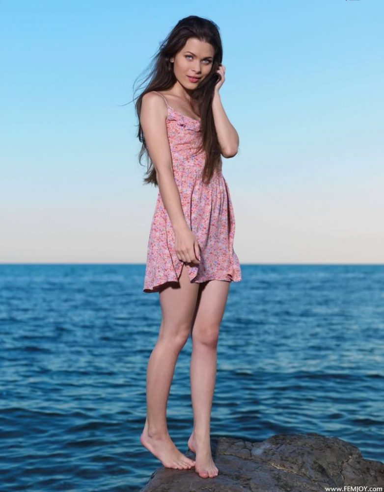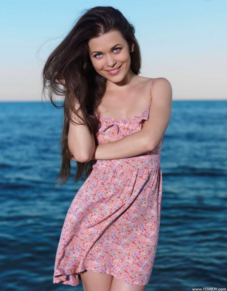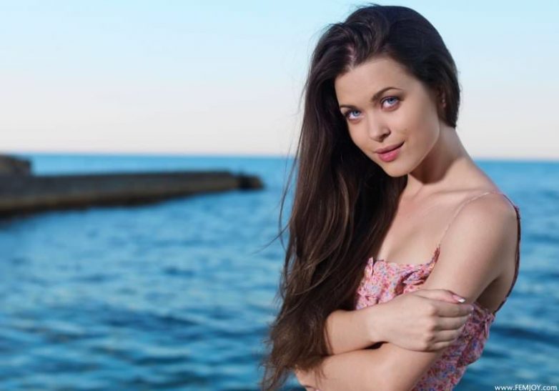 Голубоглазая шатенка наслаждается закатом на море.
