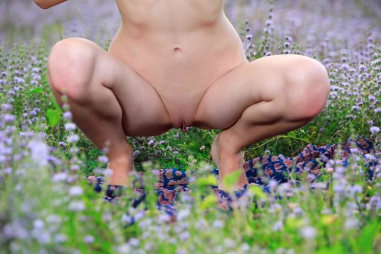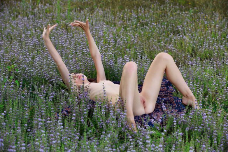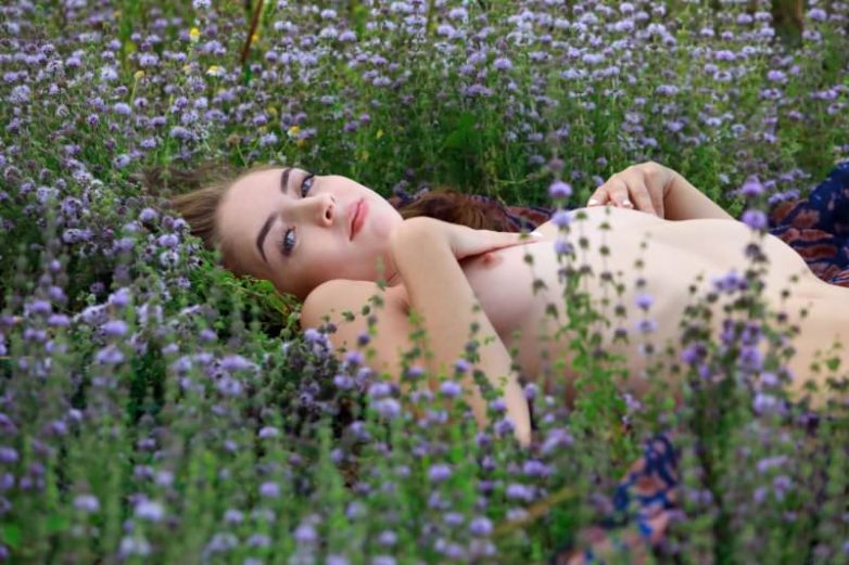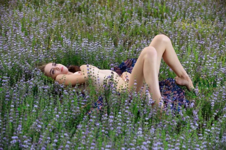 Длинноволосая нимфа наслаждается ароматами полевых цветов.