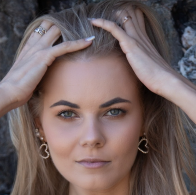 Блондинка с модельной внешностью позирует на берегу и прячется в тени скал от солнца.