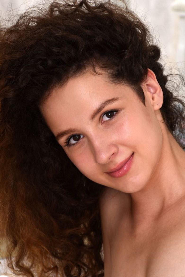 Кудрявая шатенка вертится у зеркала и рассматривает себя во всех подробностях