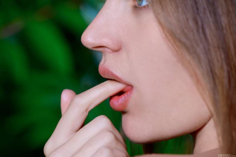 Голубоглазая шатенка позирует в зелёном купальнике на фоне сочной зелени.