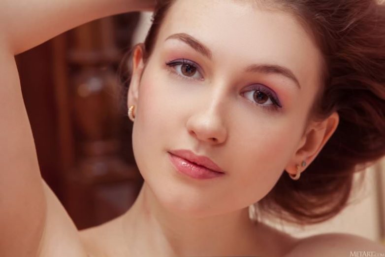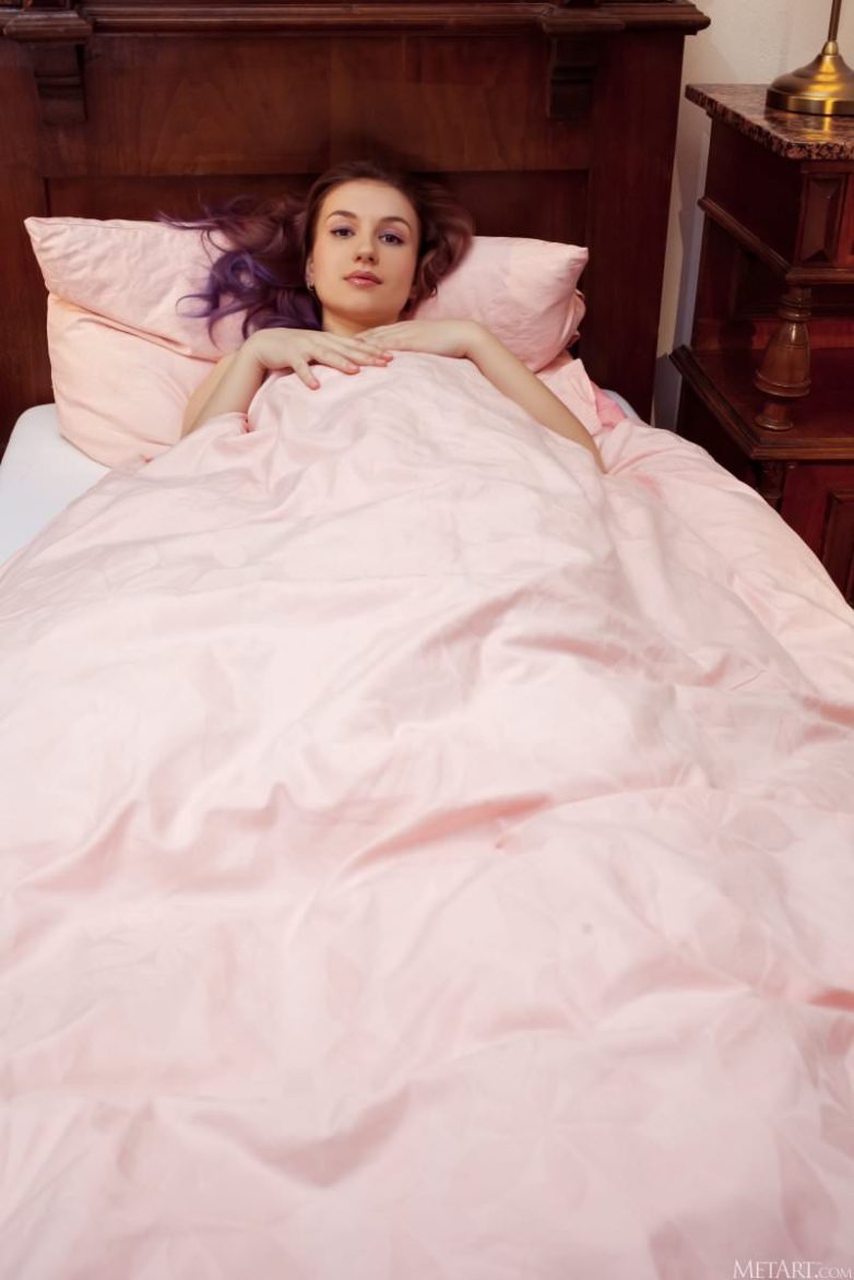 Шатенка упражняется в кровати в искусстве соблазна, насмотревшись на картину классика.