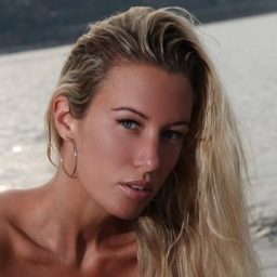 Грудастая блондинка в бикини любит фотографироваться как на пляже, так и на море.