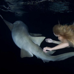 Обнаженная модель купается с акулами