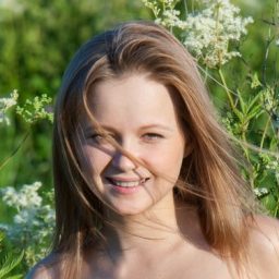 Перед нами настоящая русская девушка. В данный момент находится в лесу, где ей и предстоит принять участие во взрослой фотосессии. Девчонка мило улыбается и позирует возле березки.